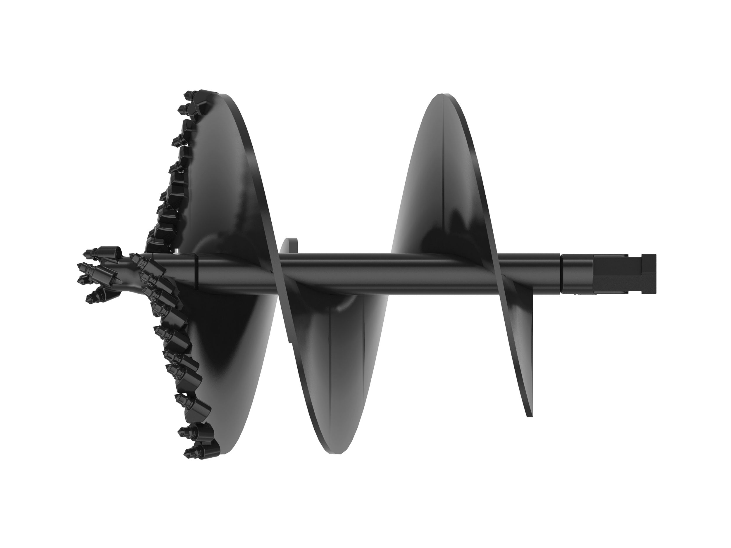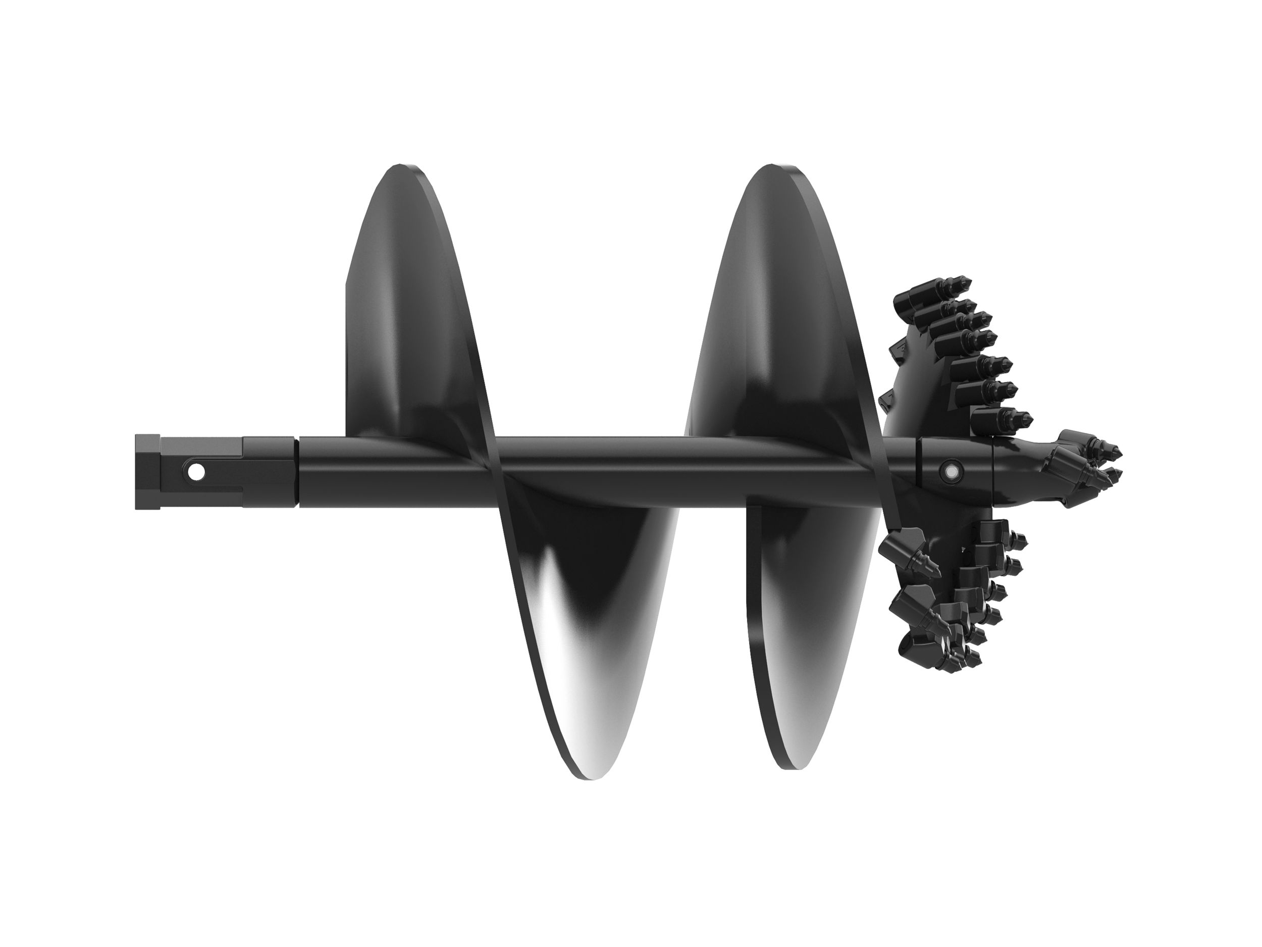 Standard rock drill head has an enlarged shoulder to increase holder protection protect the connection for use in solid fracturable rock and high impact soil. A variety of auger flights are available to handle various ground conditions. Gage teeth for the outer station and flat and/or chisel teeth for the inner stations. Flights are available hard faced or carbide to handle abrasive soil and compacted rock.