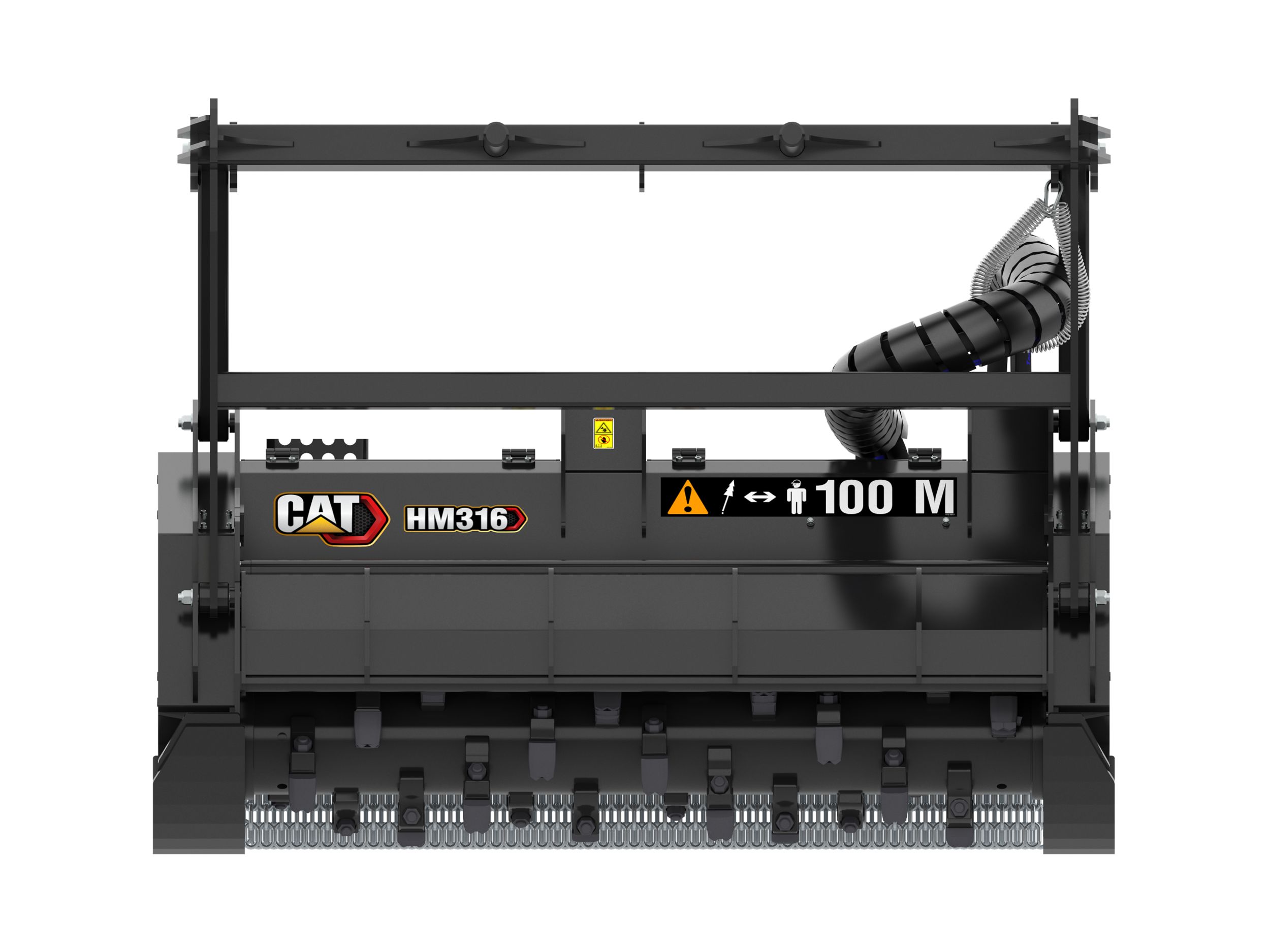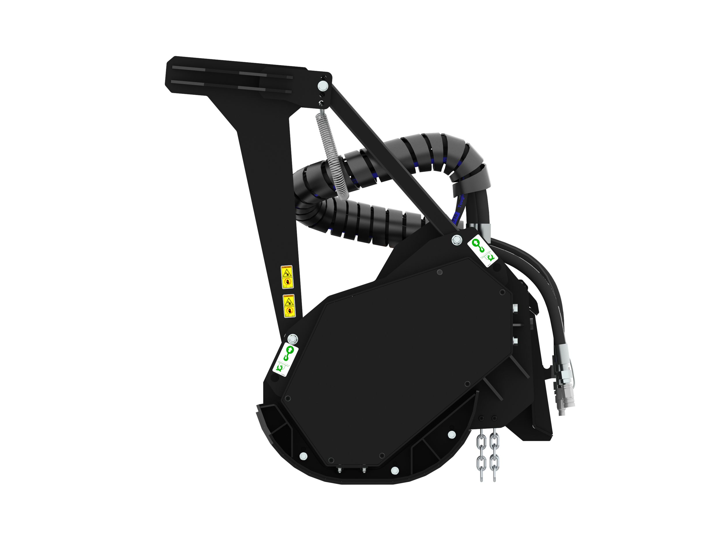 Hydraulically operated front hood is standard. Linkage is enclosed within mulcher frame on High Flow models. Quick to open and close door allows for finer finished material to be produced from cutting all types of vegetation.